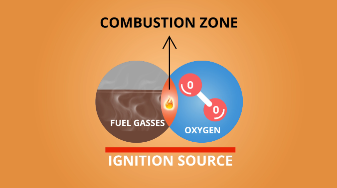 Oxygen sustains combustion. Subsequently, a chemical reaction occurs. Together, these components